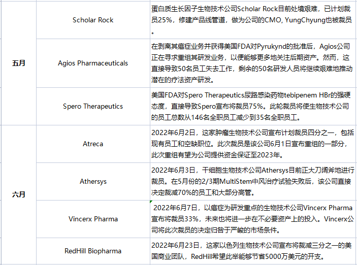 据Fierce Biotech统计,截止到4月6日,今年已有超过30家药企宣布团队缩减计划。涉诺华、赛诺菲、默克、吉利德、Biogen和第一三共等大药企,以及Biosplice、Bluebird bio、BridgeBio Pharma、2seventy bio、BeyondSpring等知名Biotech,以下为最近半年生物医药、IVD企业裁员情况一览表: