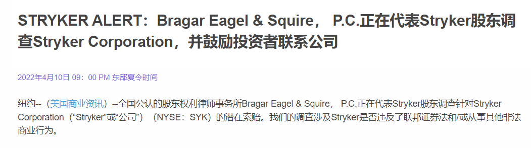 目前股东权利律师事务所Bragar Eagel & Squire, PC ,正在代表史赛克股东调查针对史赛克的潜在索赔。调查涉及史赛克是否违反了联邦证券法和/或从事其他非法商业行为。