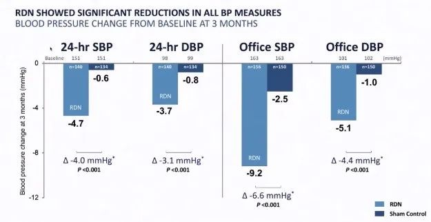 此外,试验结果还反应出,RDN的降压效果是24小时有效的,尤其半夜至凌晨心脑血管事件高发的时段,避免了药物起效慢,血药浓度存在波峰波谷的不足,降低了临床不良事件的风险。该研究结果证明了RDN可稳定降低患者的血压,且在3个月时具有显著的临床意义。