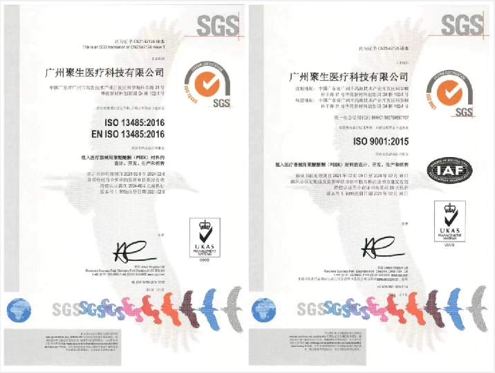 广州聚生建有符合GMP要求的十万级洁净生产车间,以确保植入级PEEK材料生产过程的洁净度。并且还通过ISO 13485和ISO 9001质量管理体系认证,拥有长期供应性能稳定、质量统一的植入级PEEK材料的能力。