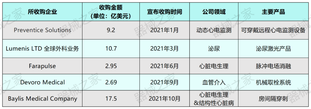 2021年,波士顿科学共进行了五次收购,其中两次收购超过 10 亿美元,2021年全年的总收购金额达43亿美元。