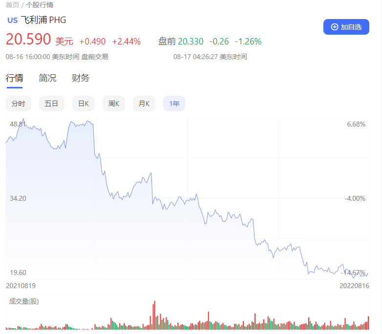 近一年来,在经历了供应链危机以及召回事件后,飞利浦股价走势一路下行。截至美东时间8月16日,飞利浦股价以20.59美元每股收盘,涨幅2.44%,公司总市值178.99亿美元。