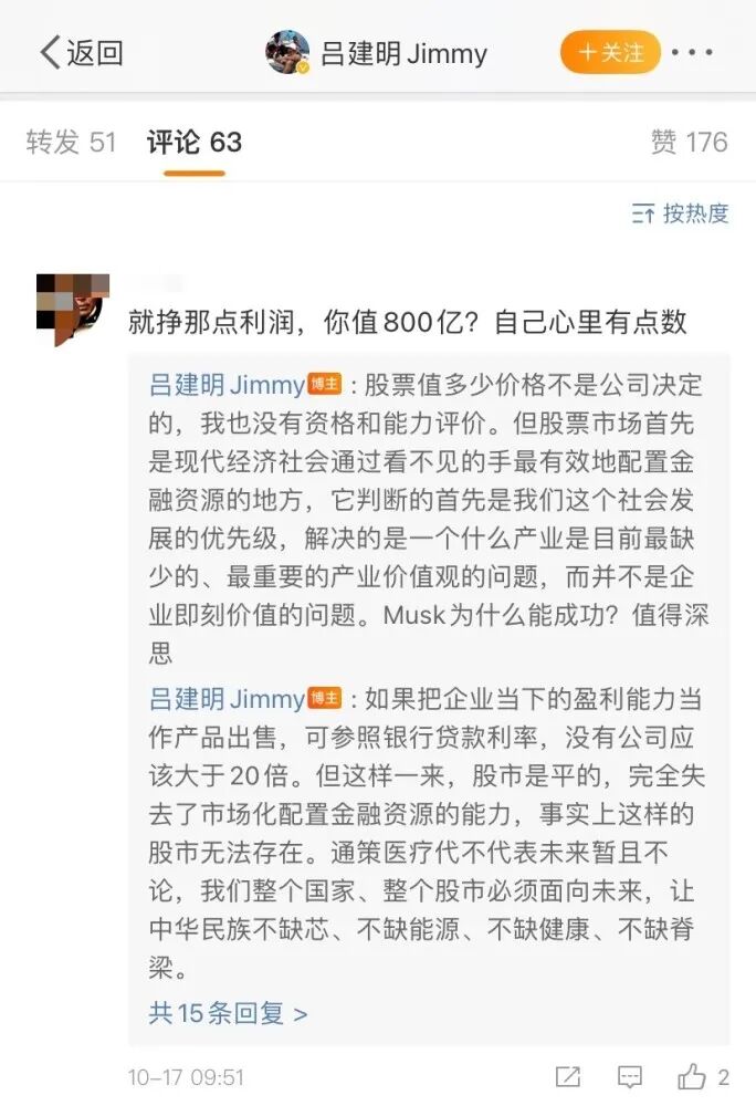 在公司股价跌跌不休之时,通策医疗董事长吕建明于2021年10月15日发博称:“我们非常自豪的成绩单!在疫情反复、政策不确定、市场超级敏感的复杂形势下,ROE、现金流等各项指标都无法挑剔。一切都符合我们的预期……通策将在稳健、卓越的道路上走得更远。”