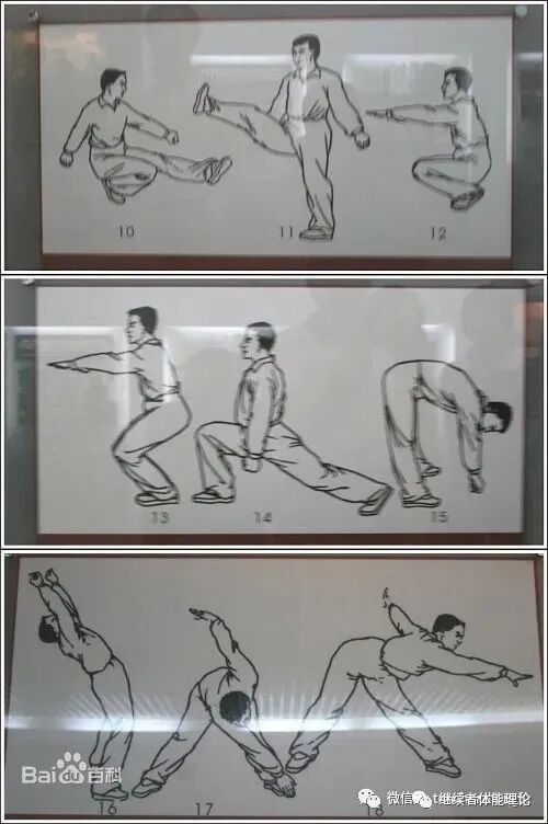 1.手握拳左右垂。足就原位一前屈,一后斜伸。2.手握拳前平。足一侧伸,一前屈。伸者可易位,屈者惟趾立。臀跟相接。3.手握拳左右垂。足一支一揭。4.手握拳左右垂。足一支一前踢。5.手握拳左右垂。足一前屈,一后伸。6.手释拳。全身一起一蹲,蹲时臀跟略接。