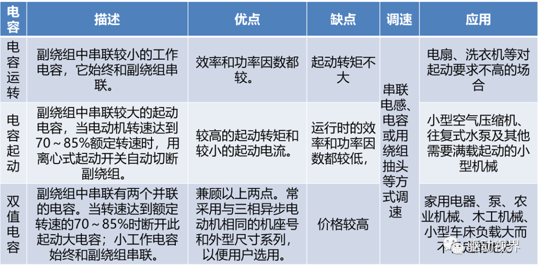 为使分相异步电动机获得较好的起动性能或较好的运行特性或两者兼有,其所需的电容(量值)是不同的,可分为三种