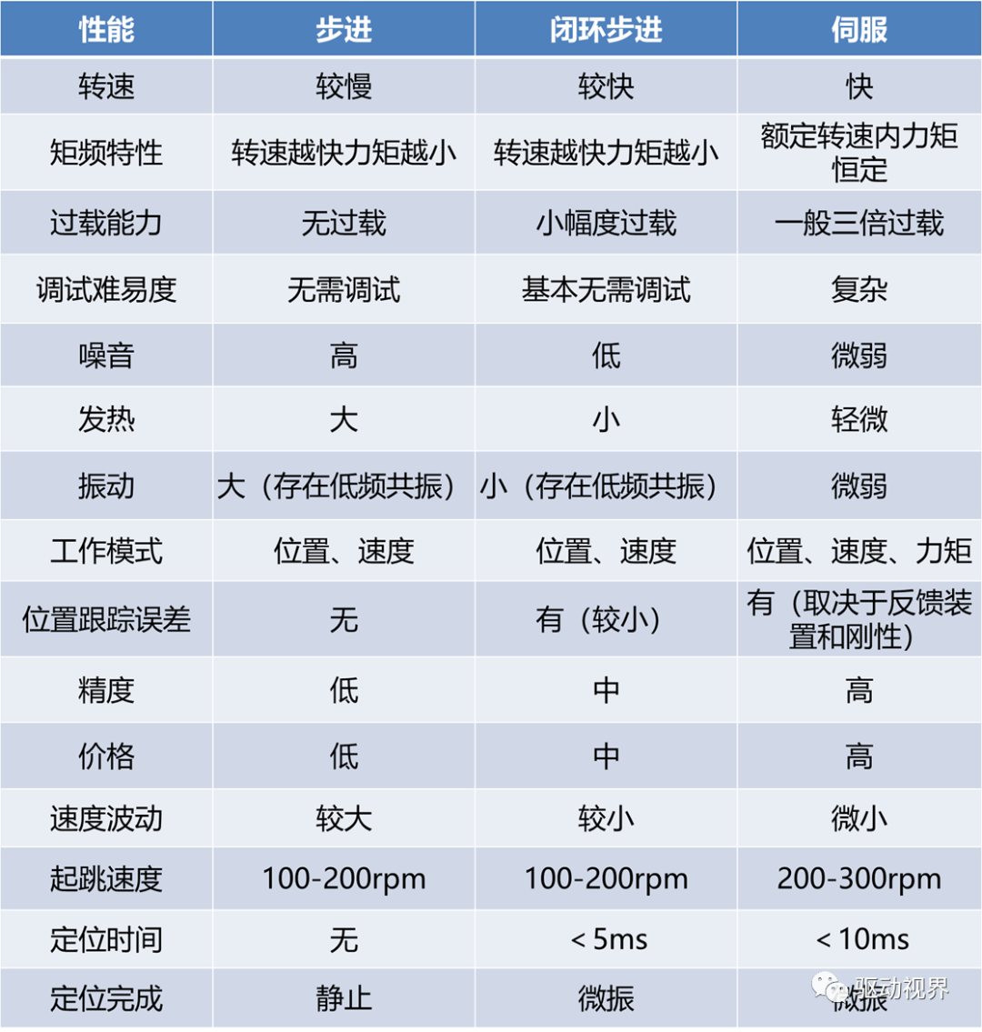 E运行性能——步进电机为开环控制,伺服电机时闭环控制;