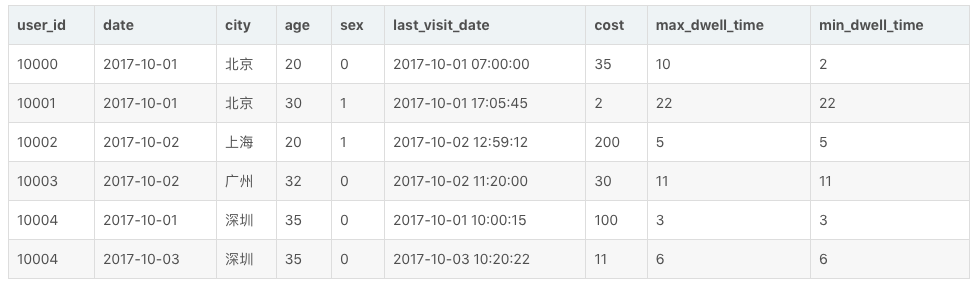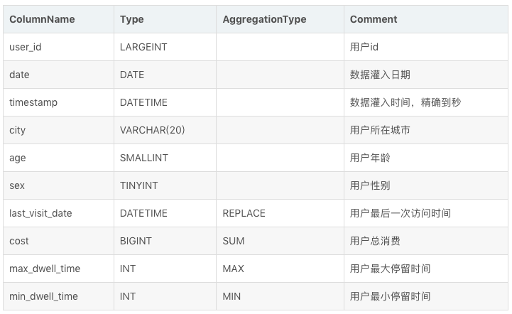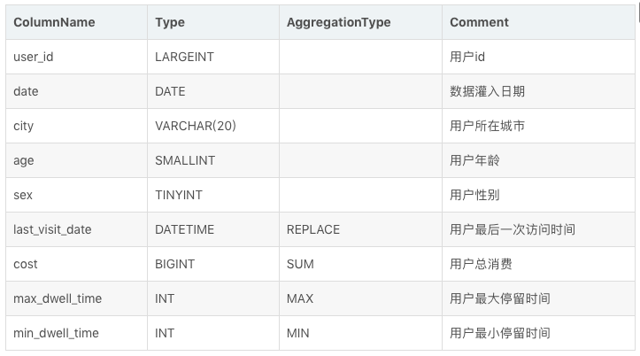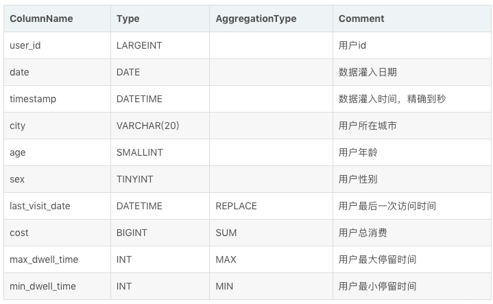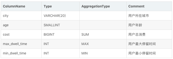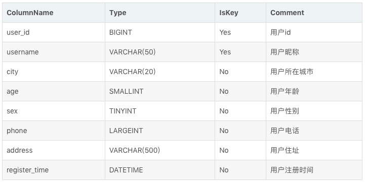 这是一个典型的用户基础信息表。这类数据没有聚合需求,只需保证主键唯一性。(这里的主键为 user_id + username)。那么我们的建表语句如下: