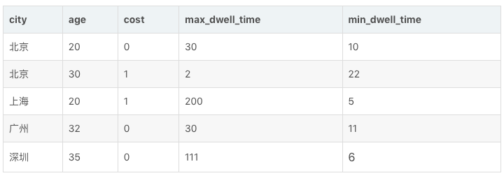 - `SELECT city, age, sum(cost), max(max_dwell_time), min(min_dwell_time) FROM table GROUP BY city, age;`