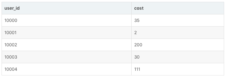 可以看到,ROLLUP 中仅保留了每个 user_id,在 cost 列上的 SUM 的结果。那么当我们进行如下查询时:
