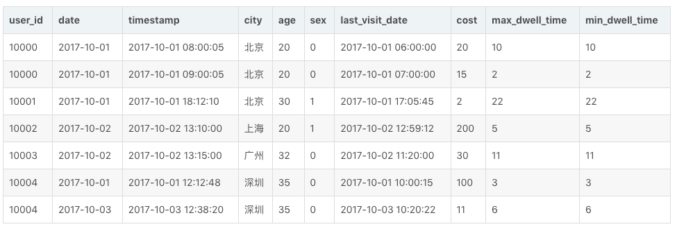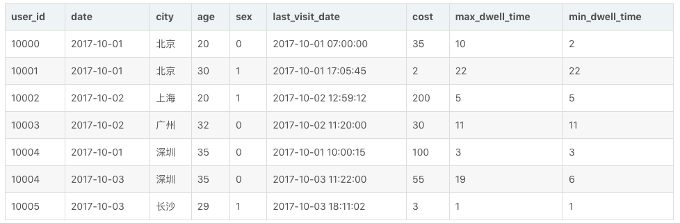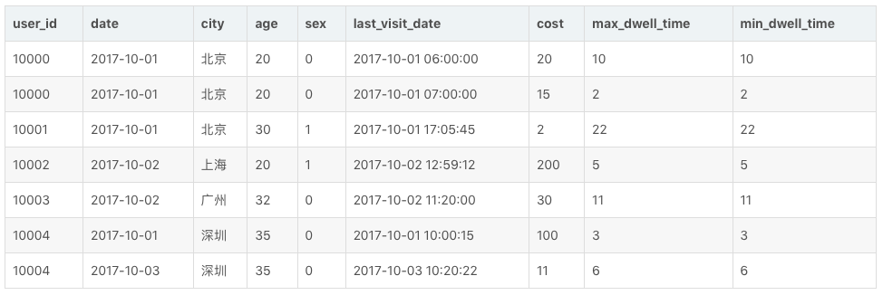 示例2:获得不同城市,不同年龄段用户的总消费、最长和最短页面驻留时间