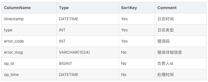 `timestamp` DATETIME NOT NULL COMMENT "日志时间",