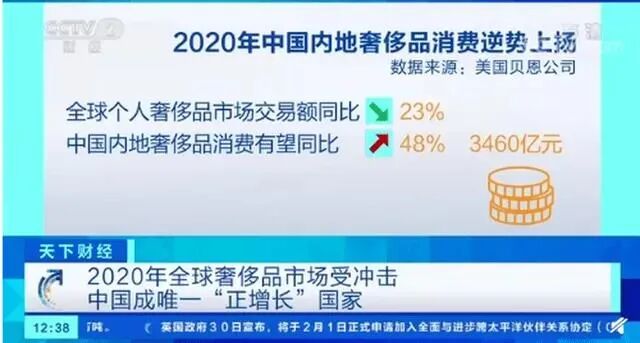 受疫情影响,2020年全球个人奢侈品交易额同比大跌23%,中国奢侈品消费却逆市上扬,猛涨48%至3460亿元。