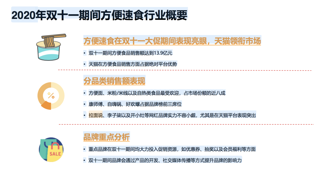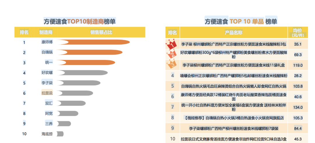而另一个速食赛道,方便食品,销售额在天猫双十一达到13.9亿元,康师傅、自嗨锅、好欢螺分别占据品牌榜前三位。