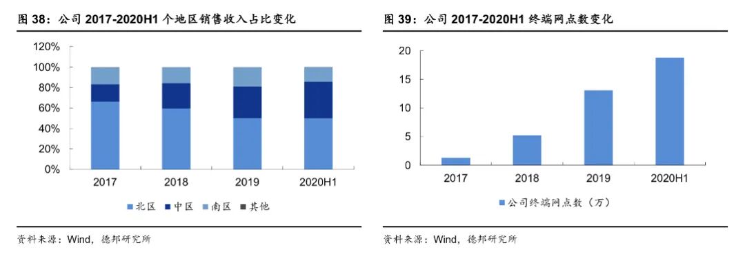 其中,按照区域划分,2019年合作经销商中北区营收份额偏高,北区/中区/南区合作经销商分别为1321/692/447,对应的营收情况分别为8.74亿元/5.41亿元/3.26亿元。