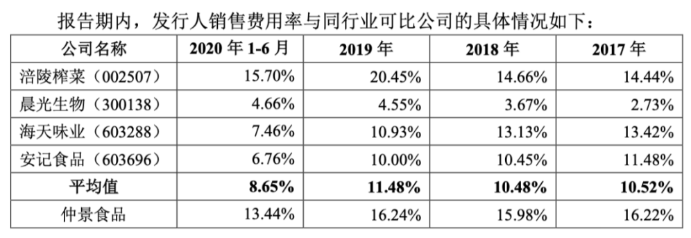 仲景食品与涪陵榨菜、海天味业、安记食品的销售费用率具有一定的可比性。
