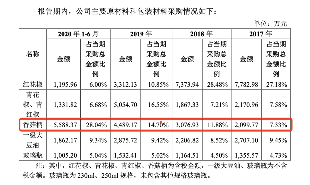 上图为仲景食品招股书的原材料采购情况,由图可知,作为香菇酱的主要原材料香菇柄,从2017-2019年的的采购金额连年上涨,占当期采购总金额比例也在持续增加。原材料价格上涨影响了净利润的增速。