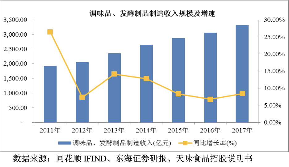 仲景食品招股书中显示,我国调味品、发酵制品行业收入从2011年的1917亿元增长至2017年的3322亿元,年复合增长率达9.59%。