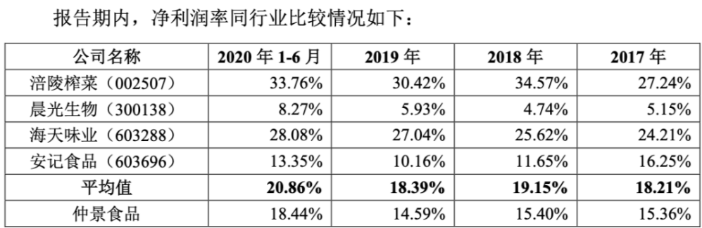同时,招股书上还显示,从2017年-2020年上半年,仲景食品的净利润率低于同行业整体水平。