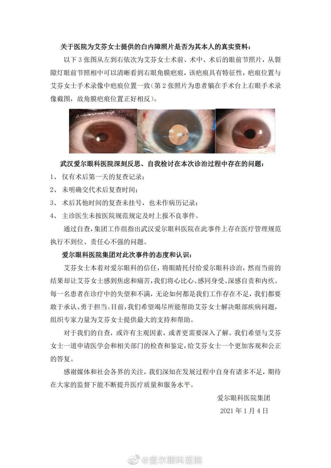 两日后,爱尔眼科官方回应:对于艾芬女士在武汉爱尔眼科医院的眼病诊治事件,爱尔眼科医院集团高度重视,迅即成立集团调查工作组,并于2021年1月1日连夜赶赴武汉进行调查。