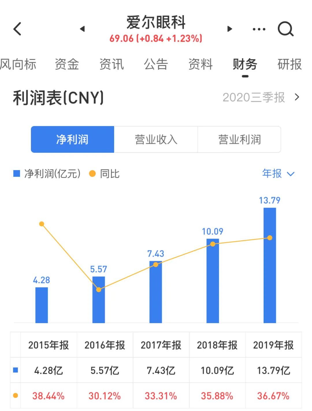 视光、屈光和白内障三大业务支撑爱尔眼科的增长,2015-2019年,净利润每年保持30%以上增长,对于一家龙头企业来说,尤为难得。