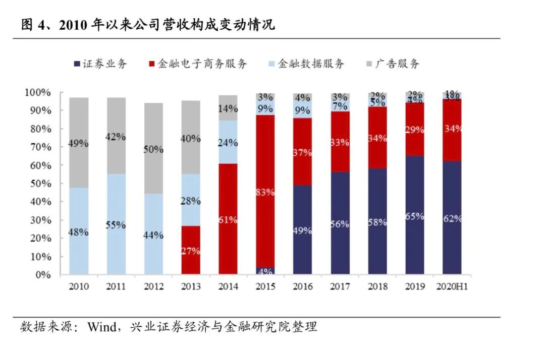 近年来,东方财富的业务重心向着证券和资管转移,根据东方财富2020H1财务报表显示,证券业务占比62%。