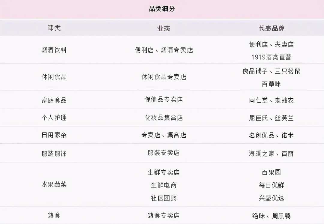 比如休闲食品这个类目,细分并形成了良品铺子、三只松鼠、百草味等品牌;屈臣氏、丝芙兰则是在个人护理这个细分类目下分化出来的新业态和新品牌;名创优品则是在日用杂品品类下分化出来的新业态。