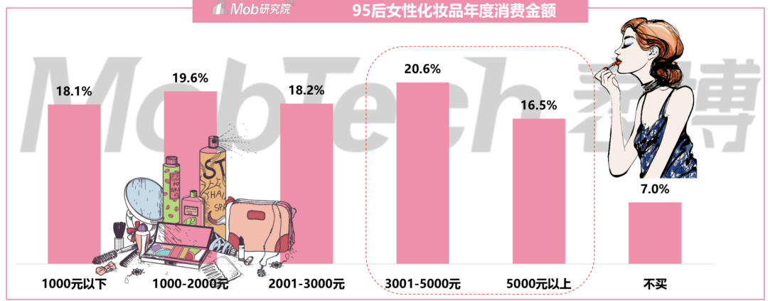 以95后女性为代表的新时代女性,37.%1的人每年花在化妆品上的金额可达3000元。在报告中显示,高学历,较高的收入,成为95后女性的代名词。