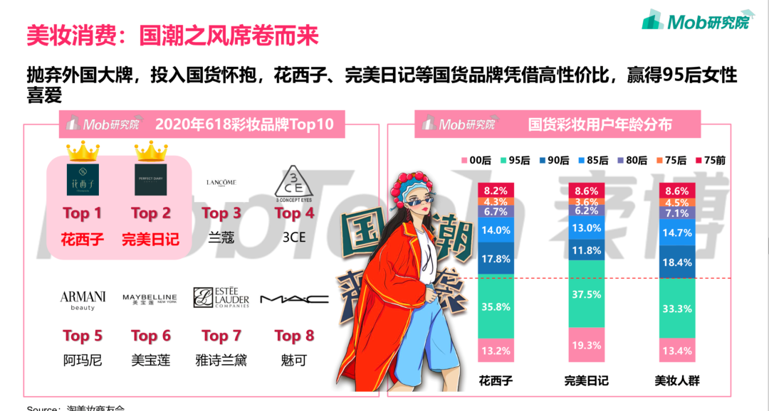 根据Mob研究显示,2020年618彩妆品牌Top10中,花西子和完美日记分列头两名,兰蔻、阿玛尼、雅诗兰黛等传统国际大牌被抛在后面。以95后和00后为主的Z世代年轻人,对于国货的认可度可见一斑。