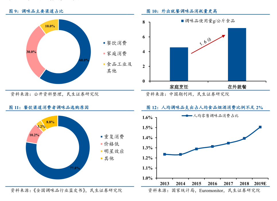 对比发达国家的调味品消费情况来看,我国人均调味品消费量仅为日本的45%、韩国的55%、美国的52%。市场增长空间至少还有2倍或者更多。