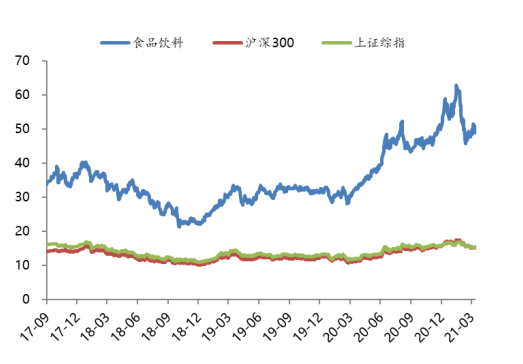 从4月末估值来看,食品饮料板块市盈率为 51.62, 同期上证综指和沪深 300 市盈率分别为 15.16 和 15.05。