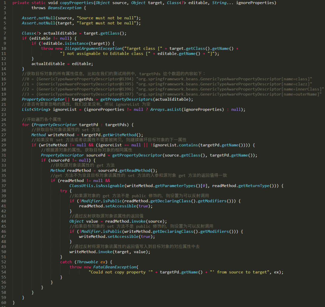 1.对于要复制的属性,目标对象必须要有对应的 set 方法(上图的第27行),源对象必须要有对应的 get 方法(上图的第34行)。 2.对于要复制的属性,目标对象和源对象的属性名称得一模一样。(上图的第34行)。 3.目标对象对应的 set 方法的入参和源对象对应的 get 方法的返回类型必须得一致(上图的第37行)。