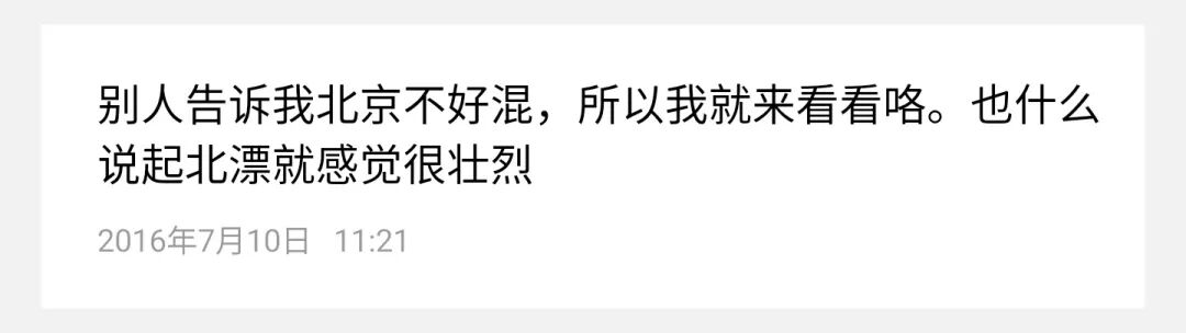 而我最终选择了北京的原因也仅仅是因为那边有认识的朋友,且大家谈到“北漂”的时候都会有一种悲壮的情绪。