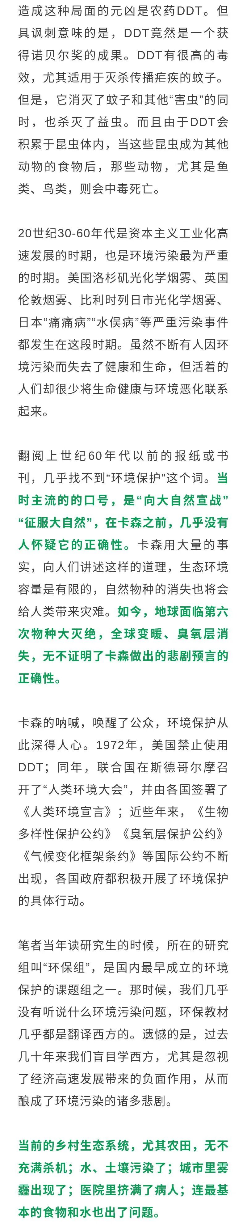 卡森的冒死呐喊,激发了波澜壮阔的全球环境保护运动,最终促进了重大的环境法律变革,这对于经济快速发展的我国有很大借鉴意义。
