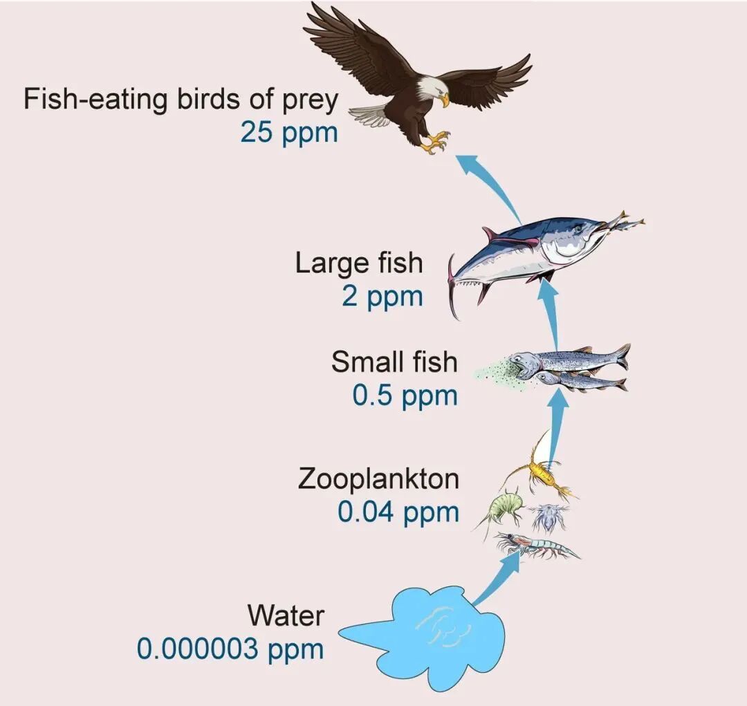DDT在水生生物及鸟类形成的食物链中被不断富集,经过几级放大,生物体内浓度甚至可达水体中的1000万倍 | 图片来源:biologywise.com