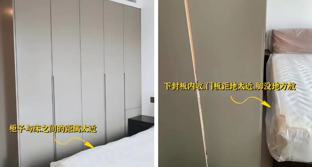 这是一个真实案例,打开柜门后,离床不到10公分的距离,这个时候,很容易碰到脚,拿东西还得侧身。