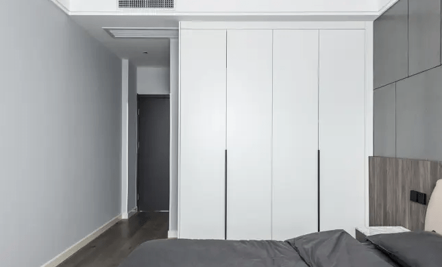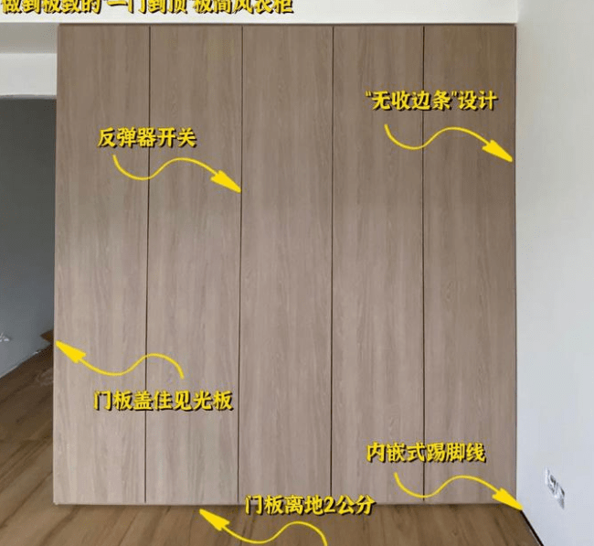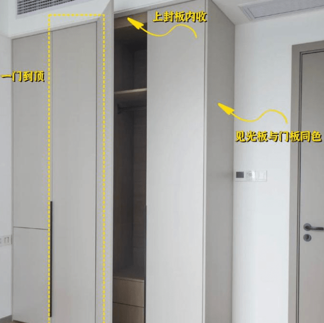 2.6米的门一通到顶,从上到下:柜门盖住上下封边。正面看过去没有多余装饰线条,甚至连把手都是做的隐藏处理或无拉手设计。