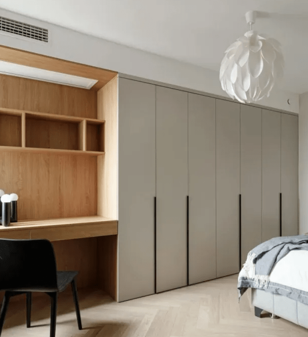 这种是现在网络上比较火的一个设计手法,柜门一通到顶,这阵风真的“太能吹”了,网红的家居博主把他们的衣柜设计案例纷纷的展示了出来,,于是业主们开始纷纷模仿。