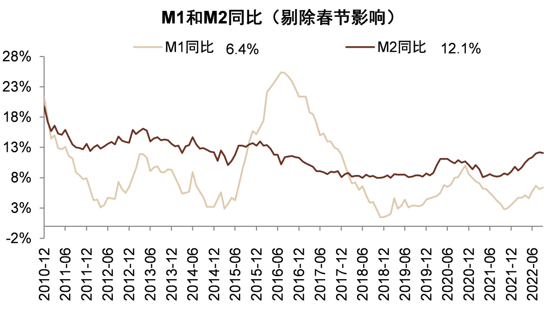 图表5:M1/M2同比增速较上个月分别+0.3ppt/-0.1ppt