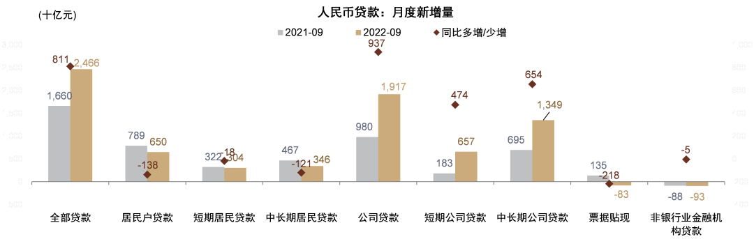 “稳增长”加速落地,信贷社融超预期。贷款方面,9月贷款规模同比多增8108亿元,主要由于对公中长期贷款和对公短期贷款贡献,两者分别同比多增6540亿元/4741亿元,多增规模分别为19个月/8个月最高,我们认为主要由于8月下旬信贷座谈会后“稳增长”导向以及政策行补充项目资本金工具到位带动基建类贷款投放加速;票据贴现同比少增2180亿元、9月票据利率回升表明信贷需求改善、票据“冲量”减少。社融方面,9月新增社融同比多增6274亿元,除贷款贡献以外委托贷款/信托贷款分别同比多增1529亿元/1906亿元,委托贷款高增可能与“保交楼”和基建贷款投放有关,信托贷款可能主要由于低基数原因。此外,政府债券同比少增2541亿元,主要由于今年发行前置及去年同期高基数。