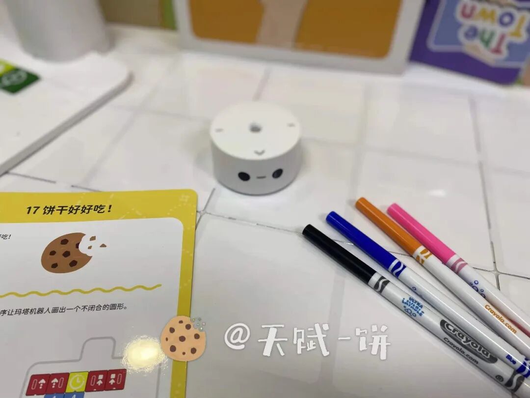 用笔在上面画一些乱七八糟的东西,让娃通过编程块控制机器人去“清扫”。当然了,玛塔机器人不会真的擦掉你画的痕迹,你只能脑补。无论主机还是增补包里的地图,都是防水的,画在地图上的痕迹用湿巾擦就行了,非常好擦。和饼饼玩绘画游戏的时候,我觉得好废纸啊,一张大A3纸只能画一个图形,而且经常不会一次成功,调试几次纸就满了。增补包里一大部分都是绘画游戏,所以特别配了这个空白底板,可以直接在上面玩绘画编程游戏。别看这个纸不厚,它比那种厚纸板的桌游底板更结实耐折,测试中反复折叠上万次都没问题。对了,去年定制版主机里只有一根笔,很多姐妹担心笔没水了怎么办。这个就是绘儿乐的水彩笔,没啥特别的,只要笔杆粗细合适,任何水彩笔都可以替代。由于增补包里的绘画游戏很多,我配了3根水彩笔,加上原本定制版主机里的1根,4支笔应该足够用好长一段时间了,毕竟它只用来画线,不会很费笔水的。写了这么多,也不知道写得够不够清楚啊,如果这样干读文字不够明白,没关系,还有搭配的视频课程。▼下载玛塔创想App观看课程