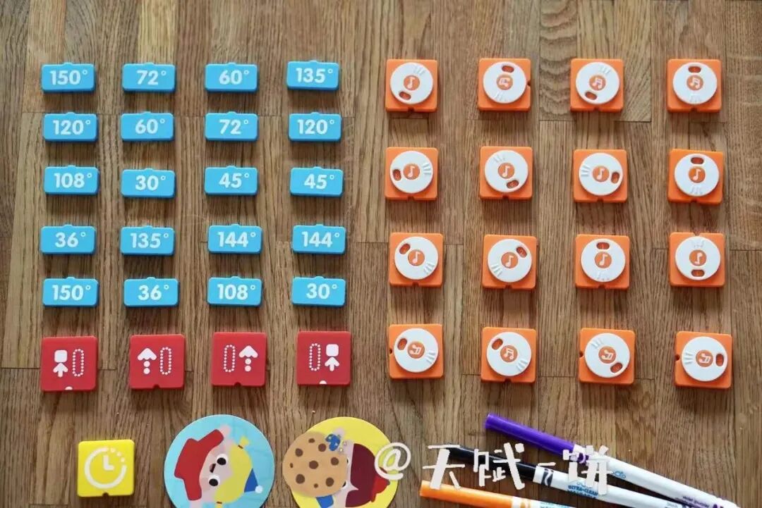 所以我决定放弃走捷径,把之前的那条困难的路再走一遍,自己定制。去年定制主机套装的时候,前后打磨了接近6个月,做出了13个主题玩法,玩法主要基于10张编程游戏地图。这些地图已经足够玩了,所以定制版增补包的重头戏,是编程维度的拓展,增加了编程块的种类(涉及绘画/动画/音乐编程块),专门设计定制了丰富的编程任务卡,任务卡数量是市面上标品增补包的8倍左右。我主要从两个维度上增补拓展:绘画编程游戏,音乐编程游戏。为了实现这两个新维度的编程,我在增补包里添加了41个编成块,这个数量是市面上常规玛塔增补包的2倍。当然了,“多”不算什么本事,真正的本事是,用有限的编程块实现尽可能多的编程任务,用尽可能好玩有趣的方式,给娃建立编程思维。为了让编程的任务更好玩,我在定制版增补包里做了30个任务卡,正反面一共43个主题编程游戏,算上拓展游戏共76个编程任务。(市面上常规玛塔增补包只有3-5张任务卡)。实际上,用增补包中的编程块可以完成的绘画和音乐编程任务,没有上限,看完这篇就知道这不是夸张。绘画编程游戏是定制版增补包中相对难的部分,就先从硬骨头啃起吧。这一节读起来可能有点费妈,不如拉队友来一起看,时不时也要费费爸。虽然读着费脑子,但我可以保证,一旦理解了背后的原理,就会有种做物理大题的思路打开的爽感。绘画游戏的编程块有两类,一类是你们熟悉的角度编程块。另一类是新面孔,画弧线的时候会用到,我给他们起了毫无求生欲的名字叫做“走走停停编程块”,或者严肃点,叫“弧线编程块”。开始啃硬骨头之前,我先来活跃下气氛,给大伙比个心。在玛塔定制版的主机套装里,也有一些简单的角度编程块,但数量和角度都比较有限,能画出的形状不多,因为绘画编程不是主机套装的重心。在增补包里,我增加了每种角度编程块的数量,而且角度种类也增加了(比如30° 、36°、 72°、 108°、 150°都是增补包里新添的角度),可以画出来的形象更丰富。▼ 左边四列是增补包里的角度编程块