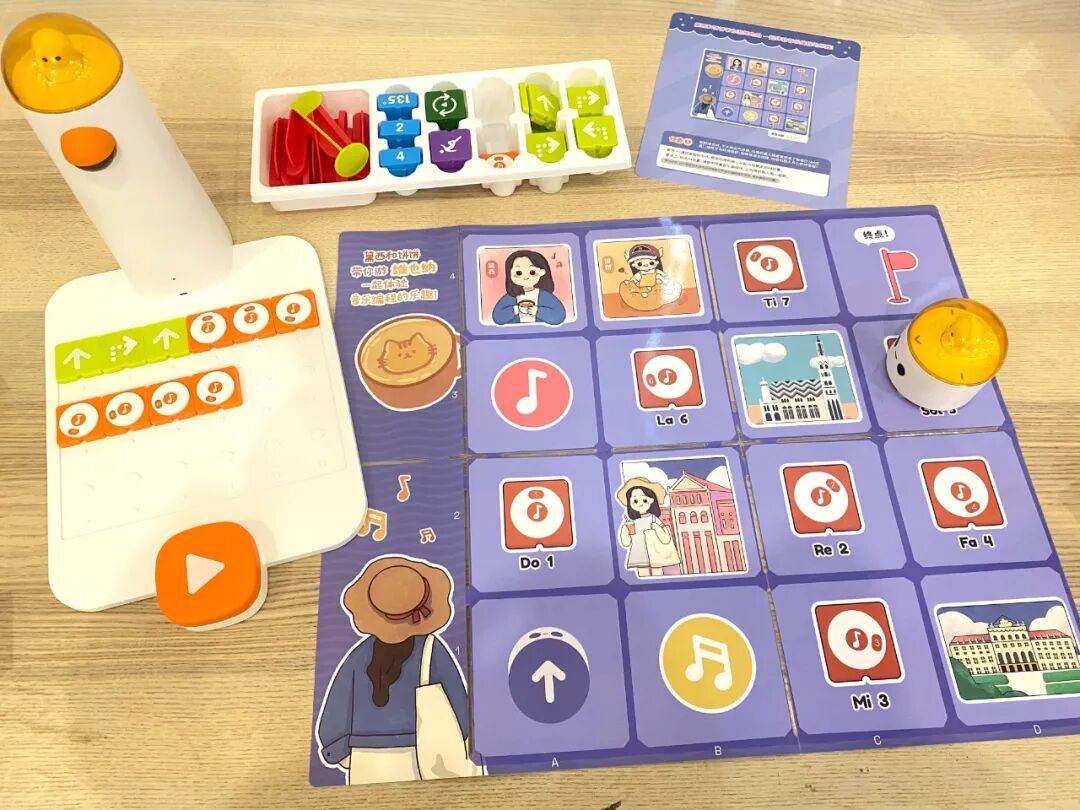 每个音乐编程块代表一个音符,音符当然是越多越好,这个道理谁都明白。但编程块也不是大风吹来的,每个编程块都要核算成本,做定制产品才深刻体会到,啥都要讲究个平衡。平衡后,我们决定给主机+增补包总共配了24个音符编程块,这样可以完成相当多的曲谱了。简单的歌谣,只要手边有一段简谱,就很容易用编程块做出曲子,定制增补包一共有16个音乐编程游戏任务,国内外都有。比如暴露年龄的《上学歌》,《粉刷匠》,不知道现在娃还会不会唱。还有地球人都知道的经典童谣,比如《玛丽有只小羊羔》(Mary had a little lam),《隔壁老王有个农场》(Old MacDonald Had a Farm)等等。