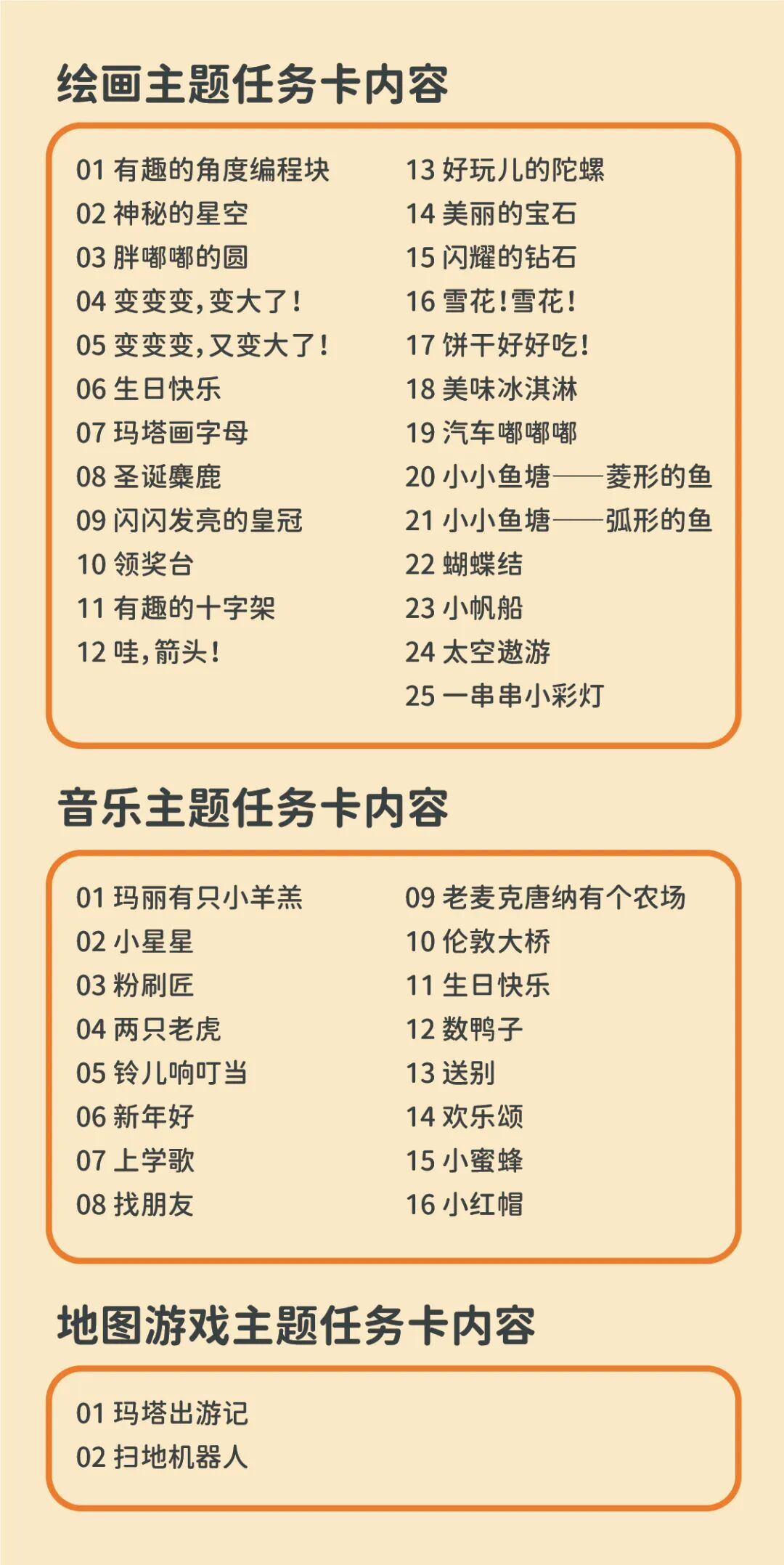 定制版增补包的重头戏,是编程维度的拓展,增加了编程块的种类(涉及绘画/动画/音乐编程块),专门设计定制了丰富的编程任务卡,任务卡数量是市面上标品增补包的8倍左右。它会让你手里的定制版主机套装更好玩,更有意义,可玩的年龄跨度更大,可玩的维度更丰富。
