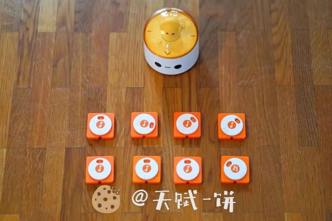 玛塔的定制包里还有个马甲,你可以给它套上,换各种表情。高塔长得像个烧水壶,壶嘴黑色的部分是关键,它是一个可以识别图像的摄像头。娃在编程面板上摆编程指令块,高塔就可以“看见”这些指令,并通过蓝牙隔空传给机器人,让机器人执行这些指令。放好所有的编程指令块,拍一下面板上的橙色大按钮,小机器人就开始执行程序了。我第一次看到这个橙色大按钮,还觉得挺浮夸的,后来陪饼饼玩得多了,觉得浮夸得好。娃在面板上完成了一连串的指令,非常不容易,很期待看效果。整个手掌郑重一拍,相当有仪式感,可以脑补出I want you的背景音效。以上就是玛塔的三大基础模块,和它们同等重要的硬件,是玛塔的编程指令块。玛塔的编程块有不同颜色,这里面是有说法的,代表不同的种类。家庭版里,四个方向的箭头各有4个,我在和饼饼玩的过程中发现,“向前”和“向后”的箭头经常不够用。所以,我在定制版里把“向前”和“向后”的数量翻了倍,增加到了分别8个。举个🌰,你放一个“向前”的编程块,再放一个“向右”的编程块,后面再加一个“向前”的指令,拍下I want you键。刚接触编程启蒙,就从控制小机器人前后左右开始熟悉编程指令块开始。数字指令块不能单独用,而是要“挂”在其他指令块上。角度是配合上面的拐弯指令块用的,比如上面,我在“左转”指令块的下面挂一个45度,意思就左转45度(而不再是默认的90度)。写过代码的人都知道,一段好的程序不仅要实现目的,还要尽量“简洁”。比如说你想让小机器人往前走三步,你可以连续放三个“向前”的运动指令块。你也可以在“向前”的运动指令块下面,挂一个数字3,同样可以实现“走三步”。这就要说说接下来的一类指令块了——预置指令块。(瞧我这环环相扣的,坚持住!)我在定制版里增加了2个眼睛发光的编程块,让小机器人的眼睛可以变色(左右眼各一个)。因为,在同一个指令块里,预置了6种不同的舞步/动作/音乐。如果你不特别说明,它就会执行预置中的第一个舞步/动作/音乐命令。如果你在它下面挂上数字指令块,比如挂3,它就会执行预置里的第三个舞步/动作/音乐命令。如果你在它下面挂一个骰子指令块,它就会随机执行其中一个舞步/动作/音乐命令。
