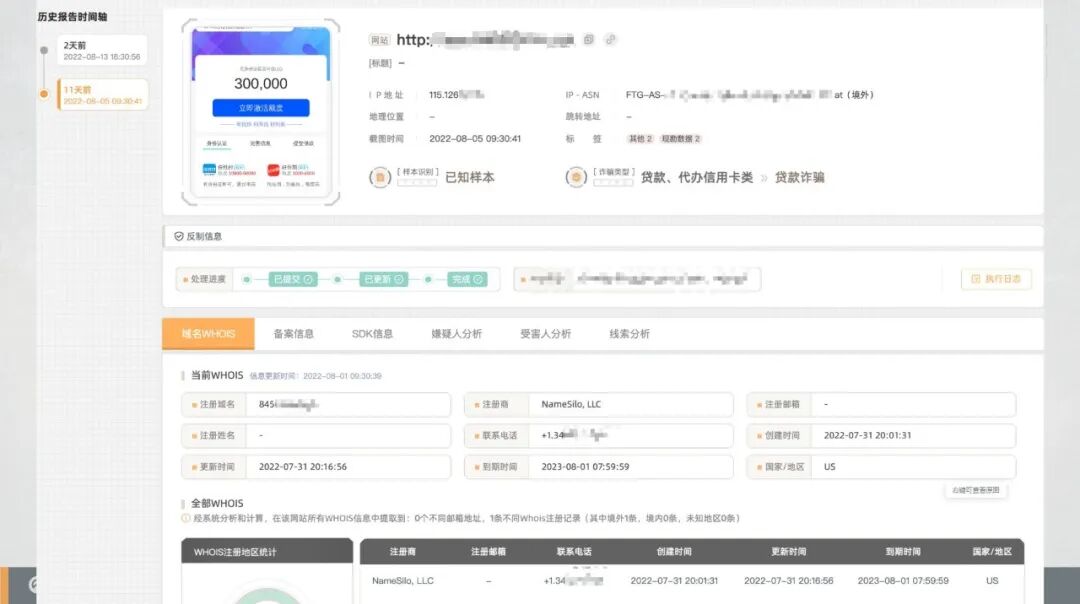 当然,对域名封堵的作用只是一时的,根据涉诈线索发现溯源反制打击平台的最新侦测结果显示,诈骗分子已经开始使用 中文+日期、中文+随机字母的方式来注册域名行诈。而诈骗分子行骗方式与手段的快速迭代,也倒逼着我们进行反制技术的更新。