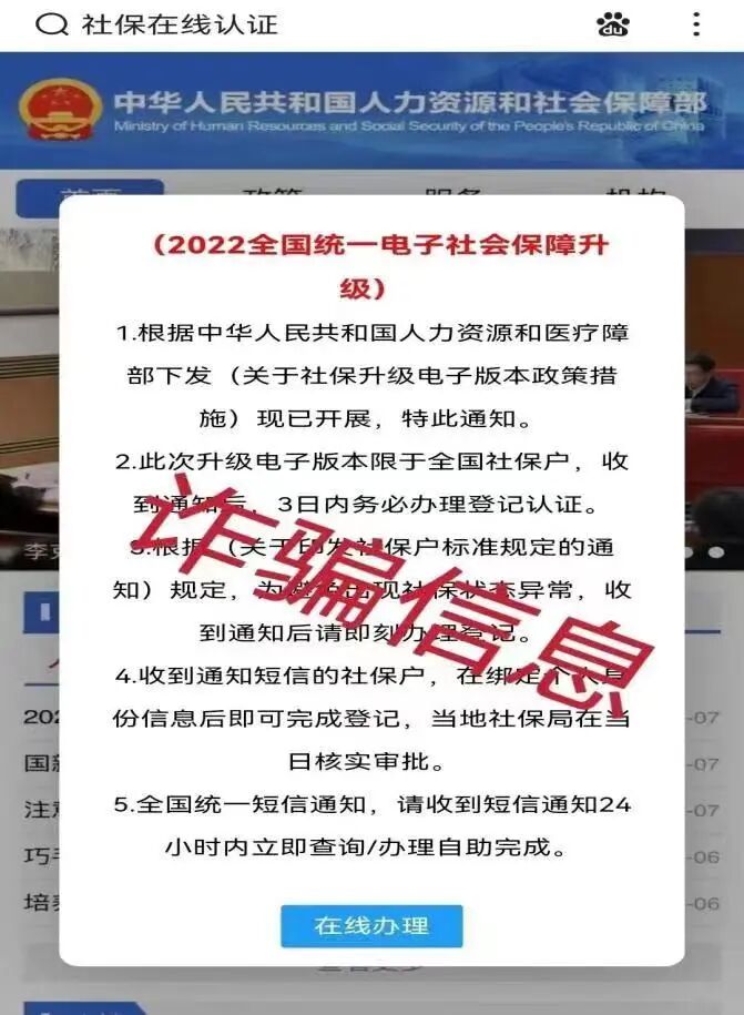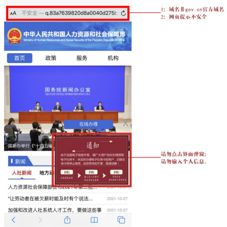不法分子伪造人力资源和社会保障部官网,并在该仿冒网站上设置了在线办理电子社保卡的弹窗,诱骗群众点击弹窗,实施诈骗。