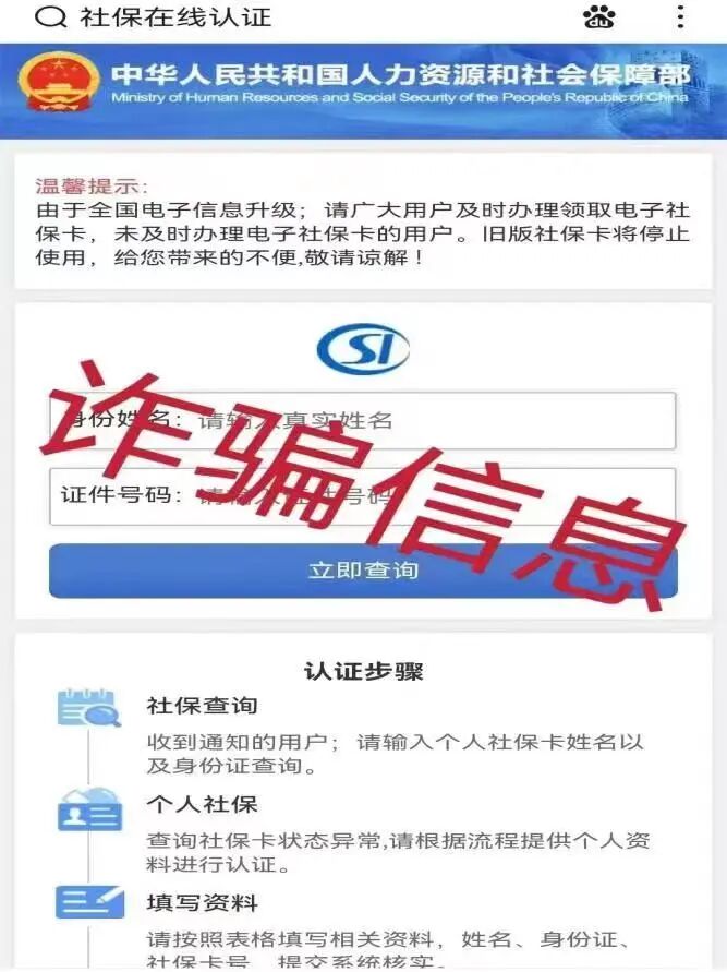 不法分子冒用社保部门名义,谎称社保卡被停用、社保个人账户将被注销,要求参保群众点击不明链接或提供个人相关信息,实施诈骗。