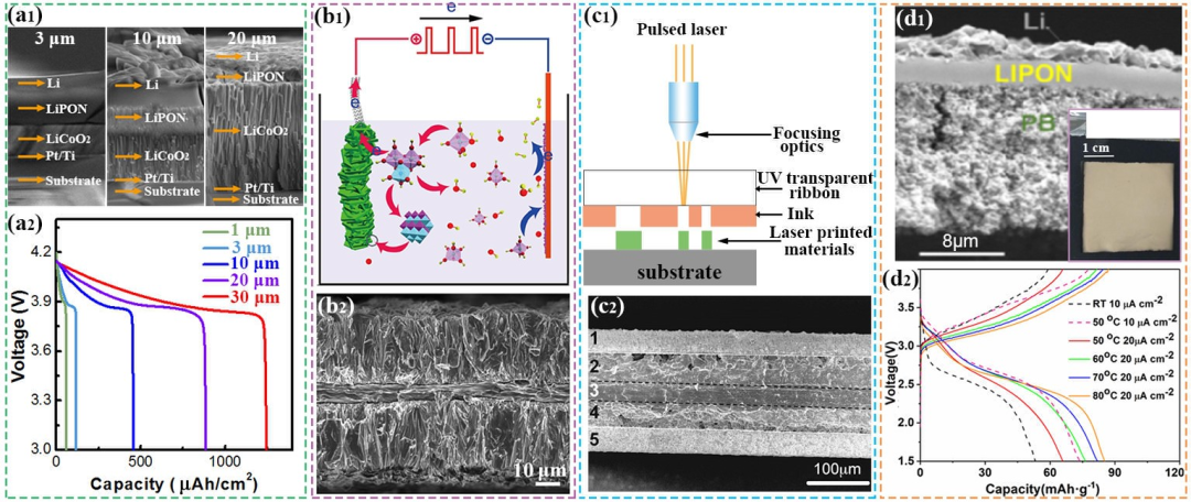 如图1a所示,TFBs是一种小尺寸固态电池,通常具有两种典型配置之一:堆叠(分层)或交错。到目前为止,逐层堆叠结构在TFBs中最为常见,而交错结构是专门为聚合物电解质开发的。对于堆叠结构,TFBs是通过使用薄膜沉积技术(如磁控溅射、脉冲激光沉积、脉冲激光沉积(PLD)、热蒸发、化学气相沉积(CVD)、原子层沉积(ALD)和印刷)来构建的。