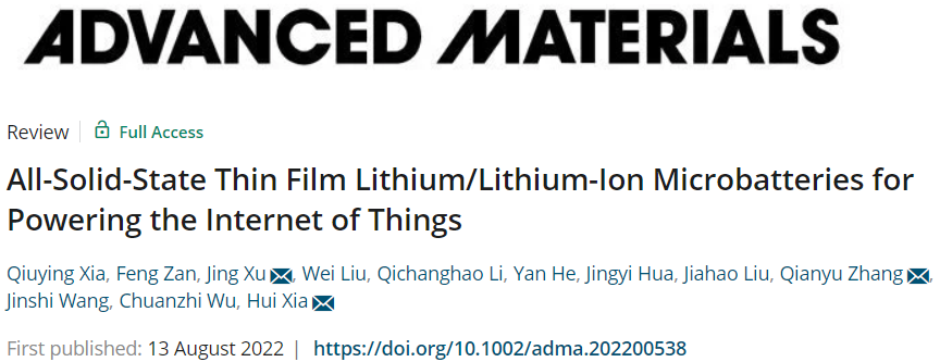 Qiuying Xia, Feng Zan, Jing Xu*, Wei Liu, Qichanghao Li, Yan He, Jingyi Hua, Jiahao Liu, Qianyu Zhang*, Jinshi Wang, Chuanzhi Wu, Hui Xia*. All-Solid-State Thin Film Lithium/Lithium-Ion Microbatteries for Powering the Internet of Things, Advanced Materials, 2022.