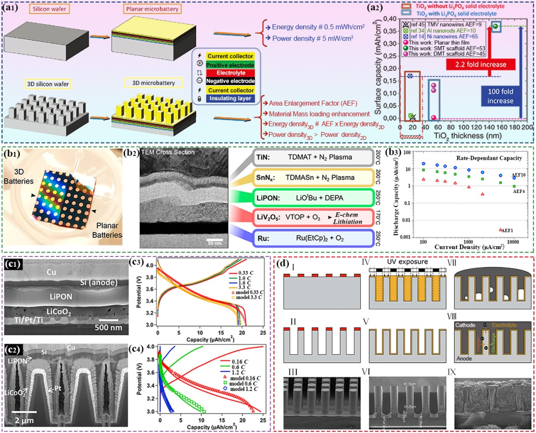 制造3D TFBs的一种方法是利用衬底(Si)的内部体积,用高纵横比的微通道或微柱穿孔。通过将电池堆沉积在这样的3D基板上,可以增加TFBs的容量,而不会因为增加的表面积而牺牲其倍率性能。结构均匀性对3D TFBs的电化学性能至关重要,而现有的PVD工艺不适用于三维结构上的保形薄膜沉积。